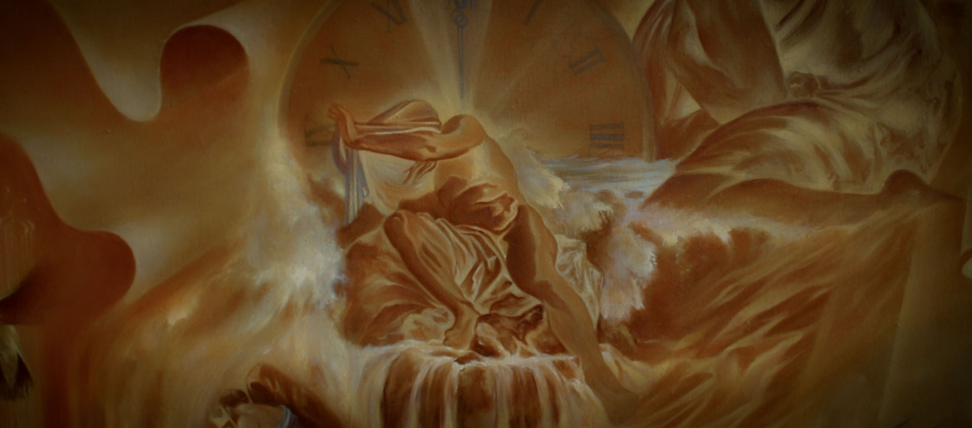 Ci-après, photos de différents parties du tableau avec les phases préparatoires en bichromie avant la mise en couleur définitive.
